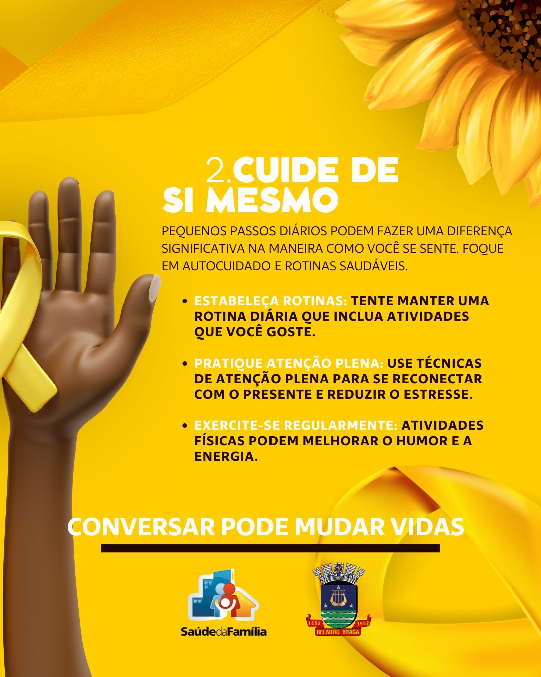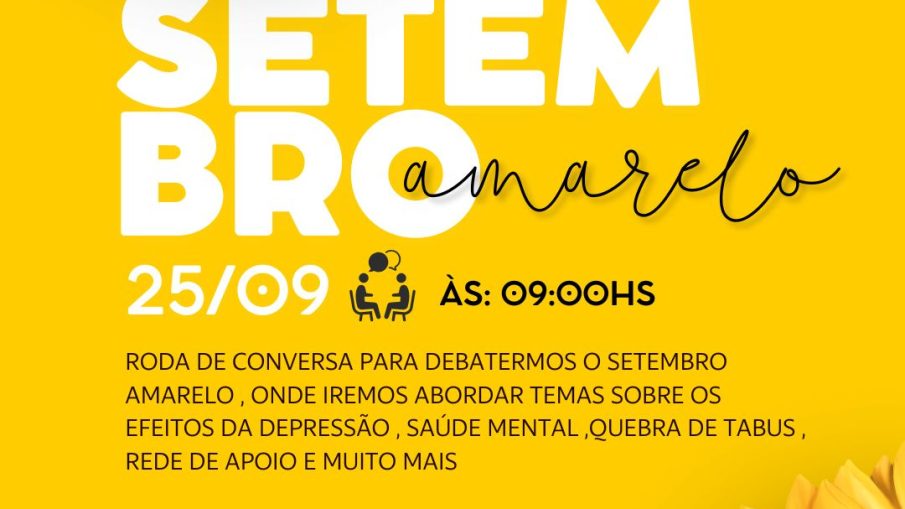 Vamos falar sobre saúde mental? A Secretaria de Saúde, por meio da ESF 2, convida toda a comunidade para participar de uma roda de conversa especial sobre a Campanha Setembro Amarelo, de promoção do bem-estar emocional e prevenção ao suicídio.
