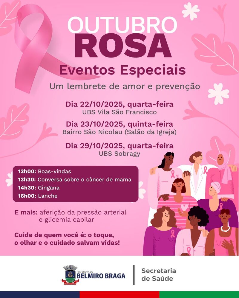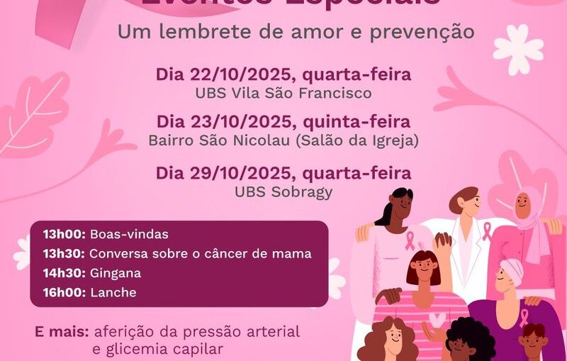 A partir das 13h, teremos momentos de acolhimento, conversa sobre o câncer de mama, gincana e um delicioso lanche. Também haverá aferição de pressão arterial e glicemia capilar.