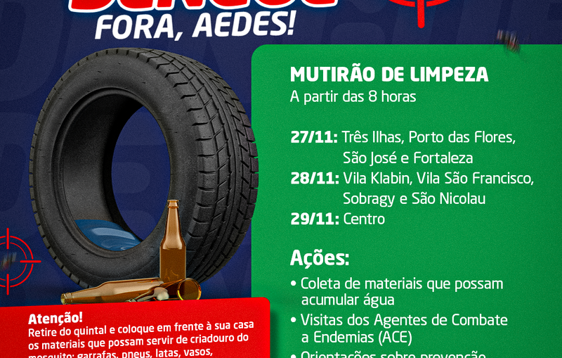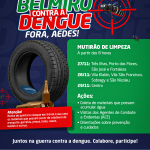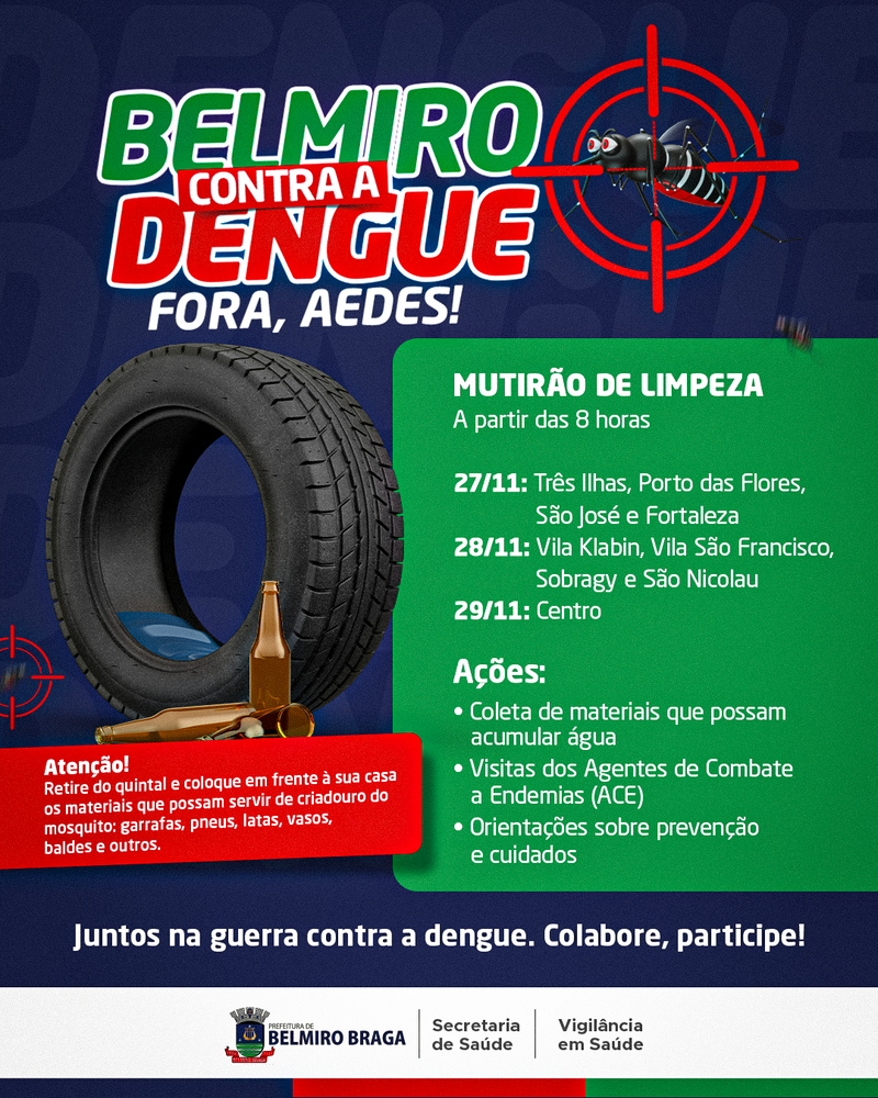 Anote na agenda! A Saúde de Belmiro Braga vai realizar nos dias 27, 28 e 29 de novembro, um mutirão de combate a possíveis criadouros do mosquito Aedes aegypti, transmissor da dengue, zika e chikungunya.