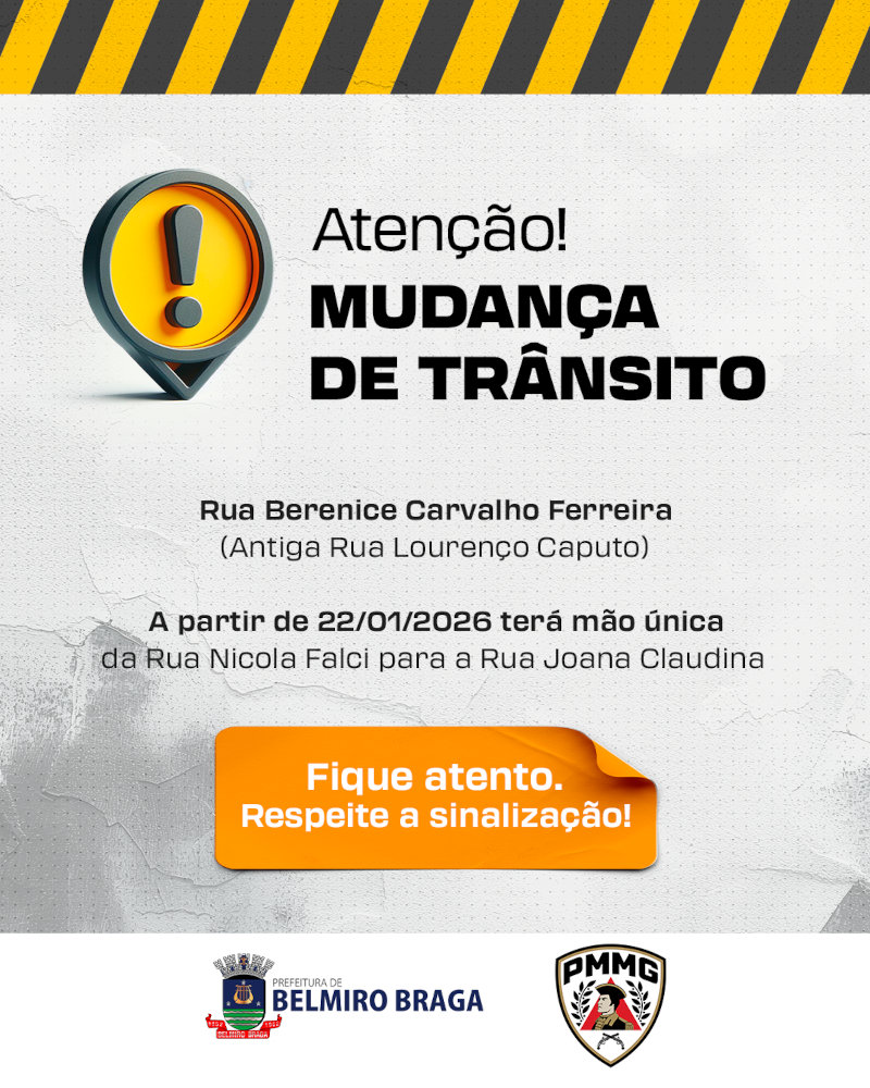A partir do dia 22 de janeiro, entra em vigor uma mudança no trânsito no Centro de Belmiro Braga, com o objetivo de aumentar a segurança de pedestres e motoristas.