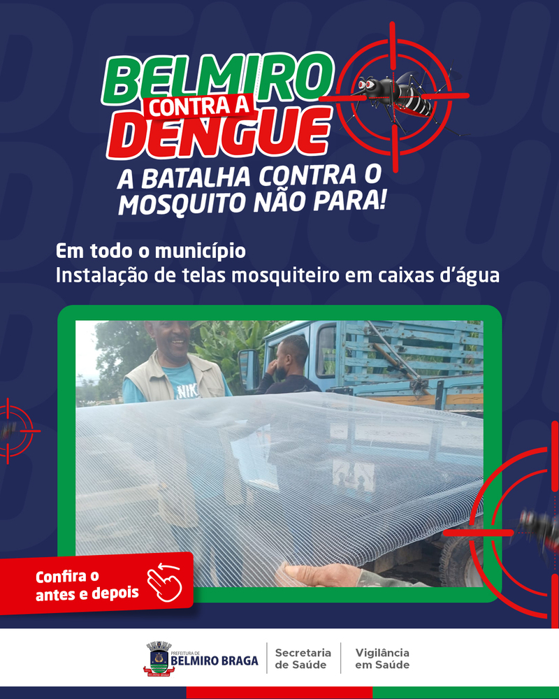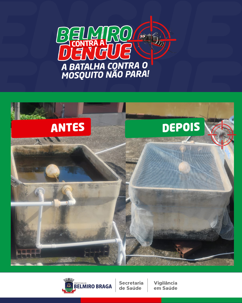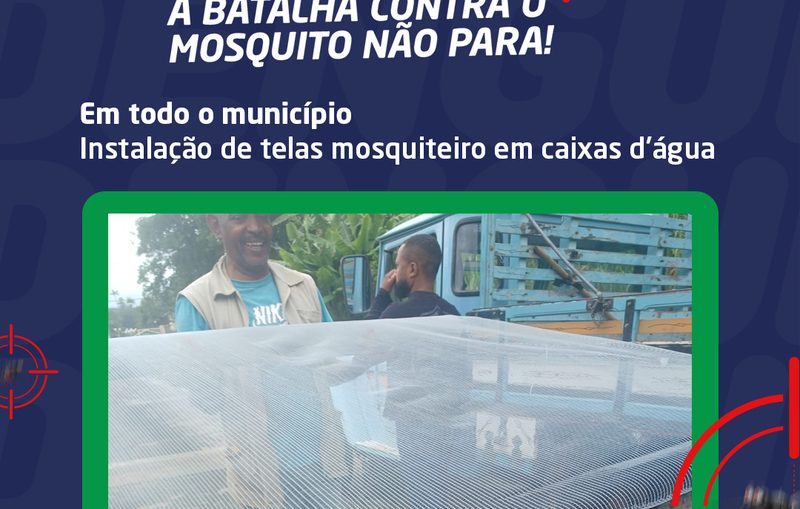 Numa ação de grande importância, os agentes de endemias estão percorrendo todo o município para verificar as condições das caixas d’água. Sempre que identificam tampas mal vedadas ou improvisadas, colocam telas mosquiteiro, impedindo a entrada do mosquito e evitando a proliferação.
