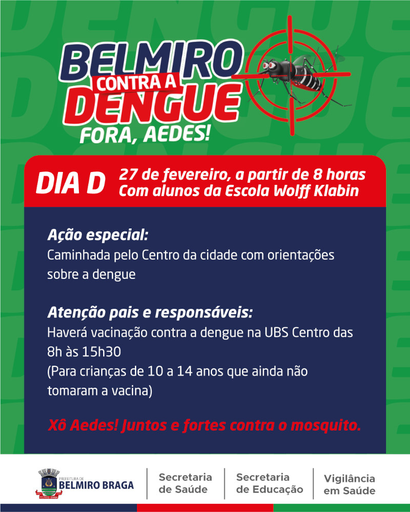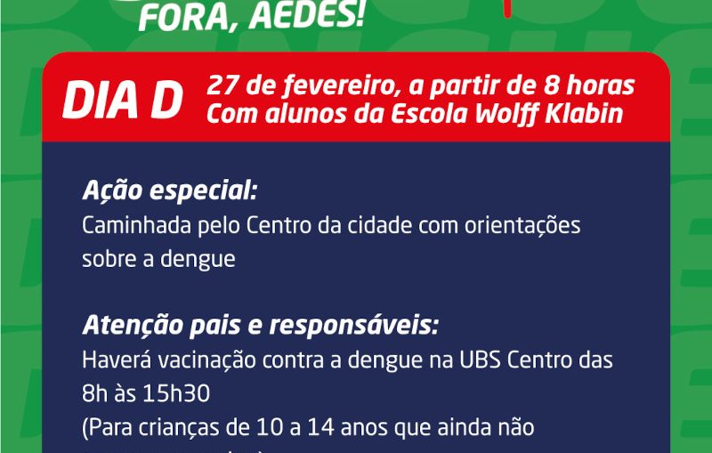 Teremos uma caminhada pelo Centro da cidade, levando orientações e informações importantes sobre a prevenção da dengue.