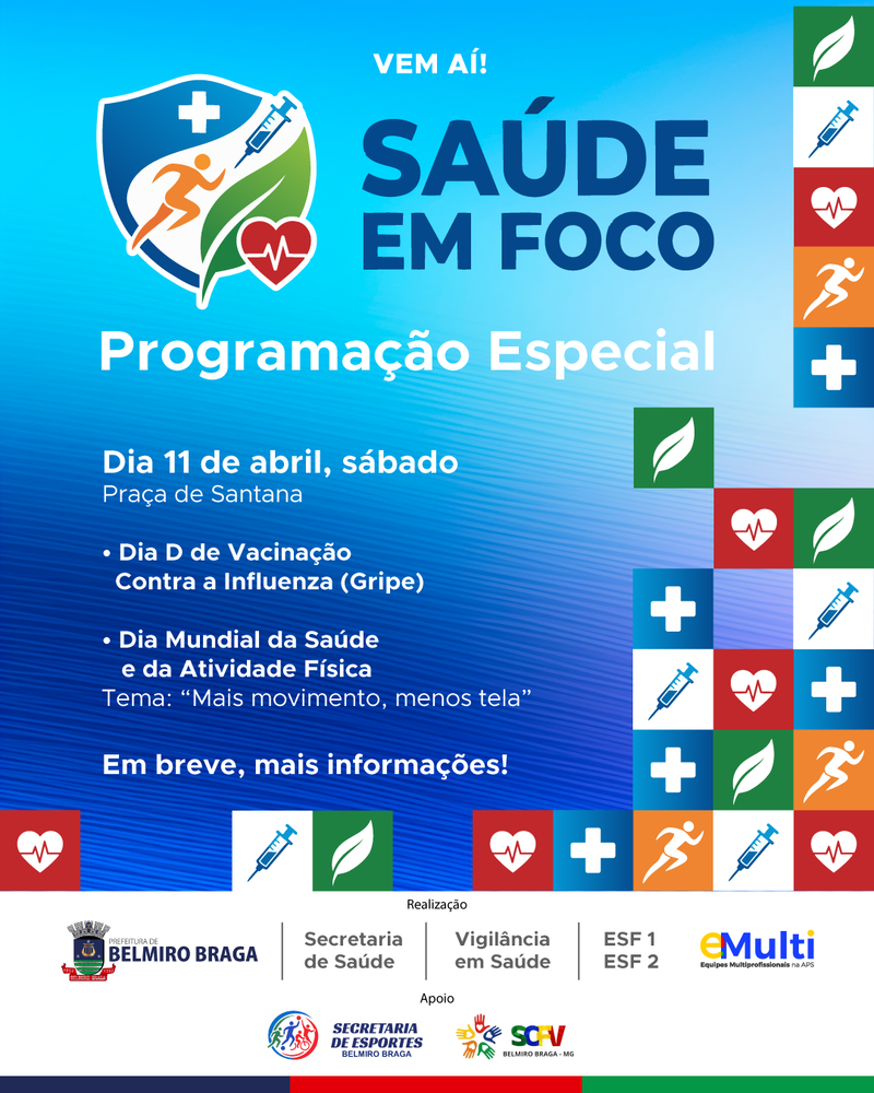 Saúde em Foco em Belmiro Braga! No dia 11 de abril, a Secretaria de Saúde promove uma ação especial dedicada ao cuidado com a população na Praça de Santana. Confira: